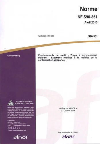 Norme NF S90 - 351 Etablissements de santé. Zones à environnement maîtrisé - Exigences relatives à la maîtrise de la contamination aéroportée