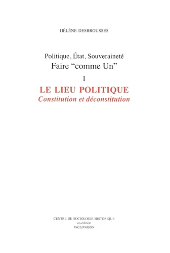 Politique, Etat, souveraineté : faire "comme Un". Tome 1, Le lieu politique : Constitution et déconstitution
