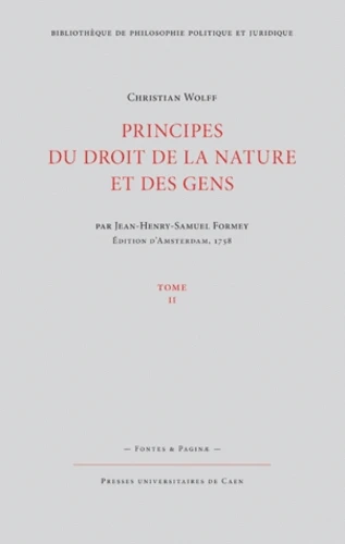 Ce n'est cependant pas la traduction française des Institutiones que Formey, le célèbre secrétaire perpétuel de l'Académie de Berlin, a donnée à l'impression, mais un autre abrégé qu'il a composé, avant la publication de l'abrégé latin de Wolff, directement à partir des neuf volumes du Jus naturae et du Jus gentium. C'est donc moins à une traduction qu'à une adaptation en français de la pensée juridique de Wolff que nous avons affaire avec les Principes du droit de la nature et des gens, Extrait du grand ouvrage latin de M Wolff publiés à Amsterdam en 1758.