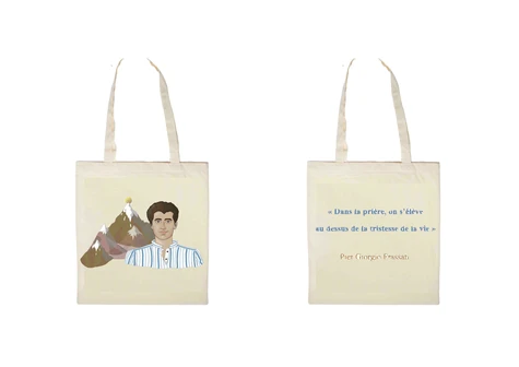 Motif original, illustration Joëlle Barbagli. Illustration de Pier Giorgio Frassati et phrase du Bienheureux : " Dans la prière, on s'élève au dessus de la tristesse de la vie. " sur l'autre face. Couleur écrue, 100% coton, 38x42 cm avec des anses longues de 60 cm. Avec son format classique (38 x 42 cm) et son grammage élevé (230 gr), ce sac en coton écru est le parfait équilibre entre légèreté et solidité.