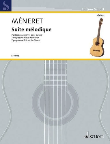 'Suite mélodique' for solo guitar by Laurent Méneret (1963) consists of seven short compositions altogether which focus on various aspects of modern guitar playing in a progressive order of difficulty. The great variety of the pieces ranging from romantic, Creole, Celtic and atonal music to waltz and mambo allows the guitarist to devote himself playfully and intensively to his instrument. Instrumentation : guitar