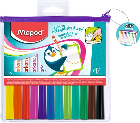12 feutres effaçables à sec fournis dans une trousse zippée.