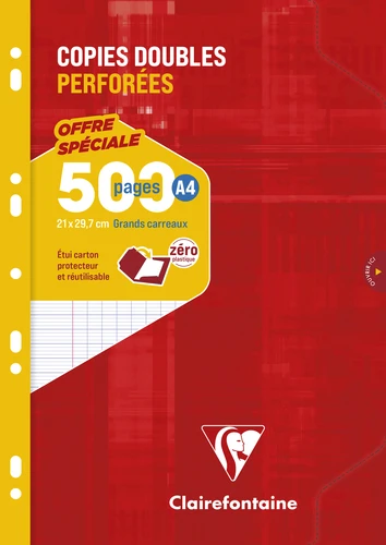 Copies doubles sous étui A4 500 pages perforées grands carreaux. Perforation universelle pour intégrer facilement un classeur. Etui protecteur en carton recyclé et réutilisable. Papier Clairefontaine Vélin Velouté 90 g. Certifié PEFC. Fabriqué en France.