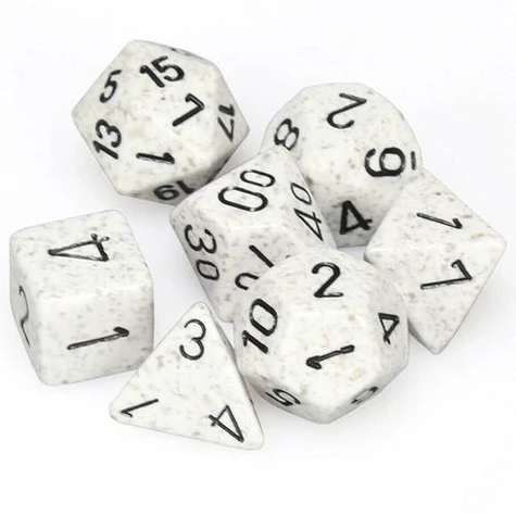 Set de 7 dés pour jeu de rôles et wargames. Couleur : Granite - Blanc artique avec lettrage gris foncé. Attention ! Ne convient pas aux enfants de moins de 36 mois.