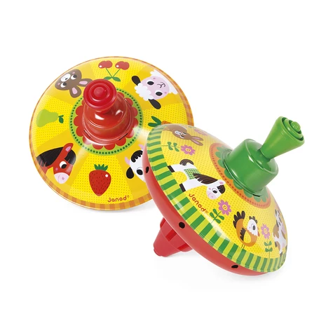 Cette toupie très colorée développera la dextérité des tout-petits. En faisant tourner la toupie, un léger bourdonnement retentit. Il suffit de pousser le levier vers le bas pour que les animaux tournent à toute vitesse et que la toupie reste en équilibre. Toupie en métal sur le thème des animaux de la ferme. 2 modèles assortis. Poignée en plastique.