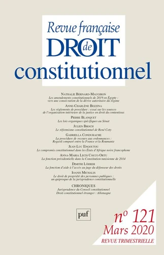 Etudes Nathalie Bernard-Maugiron, Les amendements constitutionnels de 2019 en Egypte : vers une consécration de la dérive autoritaire du régime. Anne-Charlène Bezzina, Les règlements de procédure : essai sur les sources de l'organisation intérieure de la justice en droit du contentieux. Pierre Blanquet, Les lois organiques spécifiques au Sénat et les justifications du Conseil constitutionnel. Julien Broch, En finir avec "le temps des diligences" .
